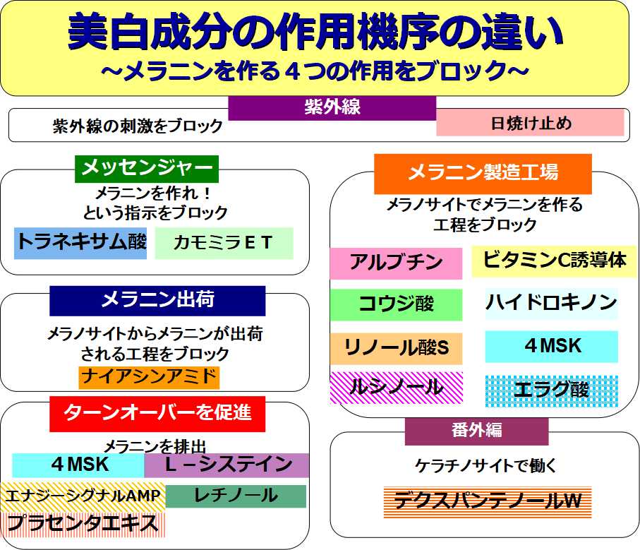 美白は美白の作用機序の違う成分を組み合わせて配合することが多くなってきました。