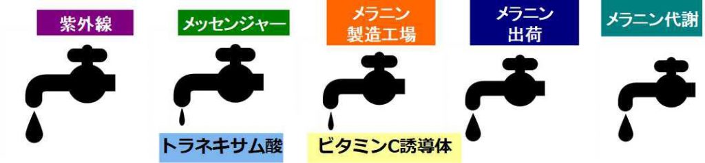 トラネキサム酸は、メラニン製造工場であるメラノサイトを刺激するプラスミンという伝達物質を抑える働きがあります。