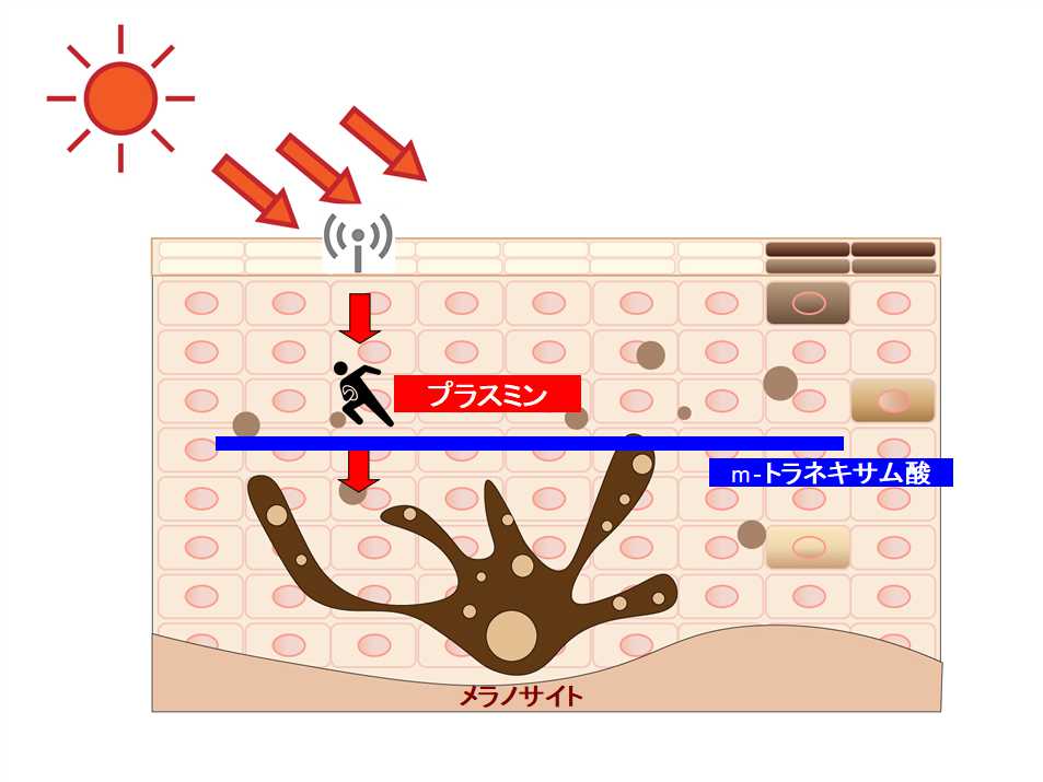 トラネキサム酸は、「メラニンを作れ!」という指示を受けたメッセンジャー(プラスミン)をブロックする働きがあります。